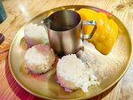 Куриный бульон, креветки, мидии, кальмары, черри, коксовое молоко, тайские пряности, грибы, зелень. Рис.