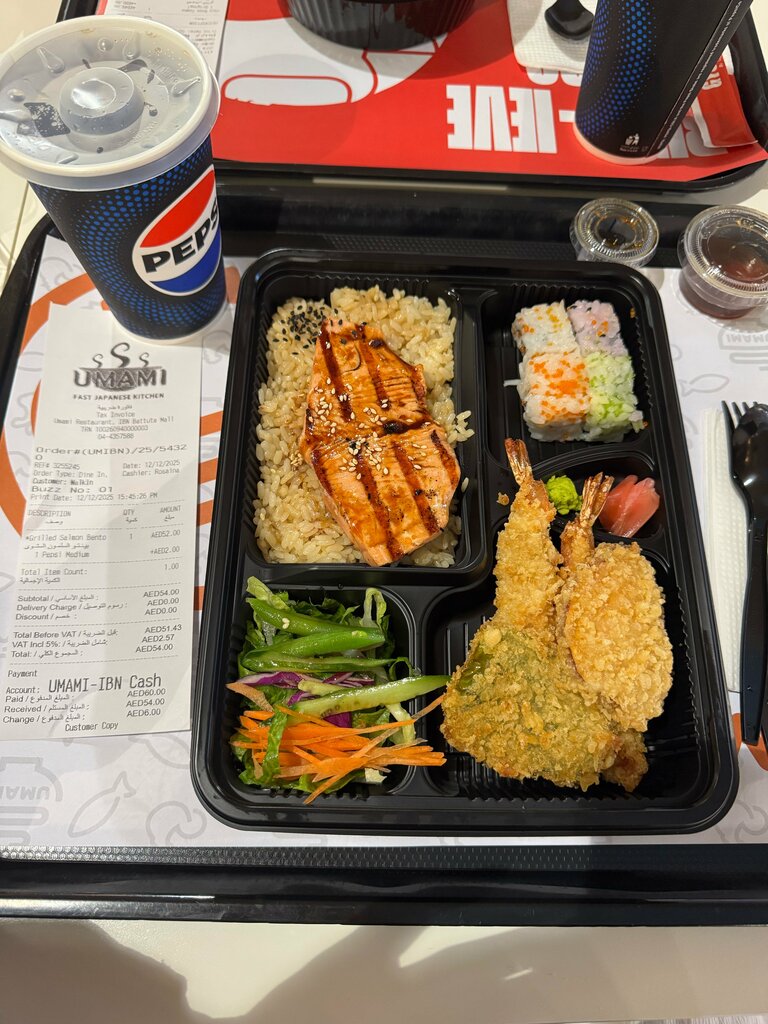 Delicious and relatively inexpensive. For a combo of salmon with rice and vegetables + pepsi 0.3 54 dirhams. The portion is hearty and most importantly delicious) I recommend it!