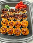 Состав: Мини роллы запеченные с лососем, Мини роллы запеченные с мидиями, Мини роллы запеченные с крабом, Мини роллы запеченные с грибами шиитаке, Мини роллы запеченные с курицей