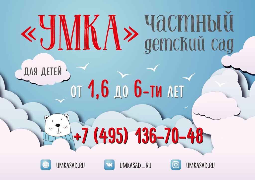 Посещали детский сад " Умка" пол года пока ждали очередь в государственный детский сад. Очень тяжело было расставаться с садом. Остались только хорошие воспоминания. Детки были всегда заняты, каждый день развивающие занятия, поделки, игры! Хочется сказать БОЛЬШОЕ СПАСИБО воспитателям и руководителю сада! Моя дочь ходила с удовольствием! Очень хороший " Бонус" в виде графика работы с 7:00 до 20:00! Посещали сад по адресу ул. Вертолетная д. 18