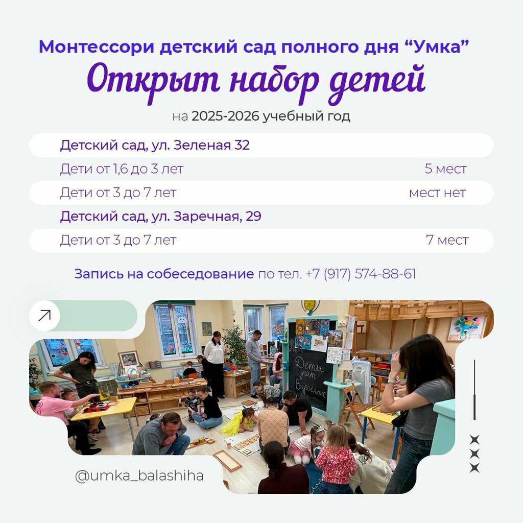 Здравствуйте! Хочу написать здесь слова благодарности всему коллективу детского сада " Умка" на улице Зелёная. Сын- выпускник, посещал садик 4 года. В атмосфере творчества, уважения, внимания к интересам и способностям ребёнка прошло это время. Сын научился читать, считать, познакомился с английским языком, умеет рассуждать на многие темы,ему комфортно общаться и со взрослыми, и с ровесниками, и с малышами . Все логопедические трудности помогла преодолеть Виктория Николаевна. Мне не пришлось записывать ребёнка дополнительно ни к логопеду, ни на подготовку к школе. Здесь много творчества, интересных праздников,прогулок, знаний о природе и окружающем мире, развитии человечества. Родители вовлечены в образовательный процесс благодаря совместным праздникам,педагоги на связи в будни и в выходные, осталось много фото и видео этого чудесного времени. Будем скучать и приходить в гости. Любимой " Умке" - самые добрые пожелания! 💗