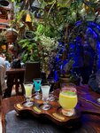 Место оказалось популярным - в январские праздники так и не удалось забронировать столик на вечер. Зато удалось пообедать аж 2 раза. Что понравилось: - Необычно и атмосферно - внутри самый настоящий сад! Как будто попадаешь в волшебное царство зелени и цветов. Качели в качестве стульев - очень круто! Кнопки вызова официантов (их местонахождение) - творческий подход! Подача счета - это вообще крайне забавно! Обойдусь без подробных описаний, лучше увидеть антураж самим. Я думаю, вечером атмосфера еще более необыкновенная. - Приветственная настойка - енотовка. Вкусно. Но так как вечером прийти не получилось, то и распробовать другие варианты настоек не удалось. - Меню в планшете. Это интересный ход, все сам выбираешь и кидаешь заказ в корзину, нажимаешь кнопку вызова официанта и он к тебе подходит. Таким образом, шансы, что официант что-то забудет добавить в заказ или что-то вообще перепутает, минимальные. - Красивая подача блюд. Приятные мелочи (комплименты) к блюдам. Размер порций - достойный. - Приятная и расторопная официантка. А вот к самой кухне замечания есть, не все блюда пришлись мне по вкусу: - Борщ безвкусный с жирными кусками свинины. Напомнило еду из средненькой столовой. - Куриный суп так же жирноват (и это нонсенс!) - Теплый фит-салат принесли одновременно с борщом, хотя закуска должна подаваться первой. В результате салатом я не прониклась - вафля, яйцо и куриная грудка уже остыли. Впечатление смазалось. - Шашлык из курицы - неплох, но бывало нежнее и сочнее. - Овощи гриль - мне показались нейтральными, а вот мой спутник нашел их превосходными. Справедливости ради отмечу, что солянка и люля-кебаб, которые выбрал мой спутник, ему показались нормальными. Опять же - оценка не выше среднего. Чай и кофе вкусные, отличная подача, все на высоте. Таким образом, ставлю 3 звезды, потому что красивый антураж в кафе - это здорово, но качество и вкус блюд, иными словами - кухня, должны быть в приоритете.