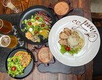 По кухне ничего необычного не нашел, суп из говяжих щёк был уверенный!) Салаты такие же, как везде... Интерьер конечно своеобразный, особенно зеркальные туалеты))) смешно! Подъезд к заведению это тропа испытаний, надо постараться найти парковку. В целом, после 5 часов дороги, даже удалось немного отдохнуть!)