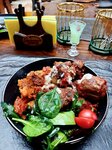 Второй раз была в этом заведении, пригласили на др. Про первый раз писать не буду, напишу впечатления про поход 2 августа. Мы были в первом зале. Подвесные стулья, много растений. Имеются следы пыли, но оно и понятно, такой специфический интерьер не просто содержать в идеальной чистоте. По натянутой ткане в районе потолка бегала мышка))) Еда, ну вообще ничего особенного. Оливье вообще не вкусный. Бутерброды обычные, нарезки трудно испортить. Горячее мне не понравилось, был рулет (вроде куриный) очень много майонеза внутри, фри, ну оно и в Африке фри. Не понравилось, что в танц зале невыносимо жарко, на просьбу включить кондиционеры, персонал отвечал, что они включены и уходил, они конечно не работали, т.к. даже стоя под ним, холодный воздух не дул. Музыка, как в любом заведении такого плана, заказать песню 300р. Туалет это конечно нечто 😂 👍 пора уже переделывать взрыв буйной фантазии из 90-00х Понравилось меню на планшете 👍 Имеется небольшая детская зона . Персонал в принципе отзывчивый ( за исключением момента с кондиционером) Бара как такого нет, коктейли там не делают. Сказать, что специально пойду туда и мне очень понравилось, нет не пойду, мне не понравилось 😊
