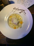 Очень атмосферное место, но еда на сильно среднем уровне. Телячьи щёчки - моё любимое блюдо, но тут были худшие, где я их когда либо пробовала, просто как отварная говядина. Дочка брала карбонару, так это гора макарон, на которой лежало 2 целиковых куска бекона. В стол брали сырные шарики, а там внутри какая-то каша вместо сыра. Потом дети брали молочные коктейли, клубничный был с химическим вкусом, видимо самый дешёвый сироп, и половину не выпили.
