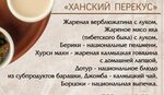 Были в этом национальном ресторане, заказывали ханский ужин и закуска кочевника. Ужин это большая тарелка разного мяса, подойдет на компанию мужчин- очень много мяса! Пиво разное бутылочное. Еду готовят и приносят оперативно) Закуска кочевника на любителя, на блюде много сала от горба верблюда, немного сушечной баранины и сушены творог в катышках. Лишнее могут положить в ланч-бокс на вынос. Интерьер на любителя. Туалет соответсвующий. Но если будете проезжать мимо, обязательно посетите. Мясо очень вкусное, к посещению рекомендую!