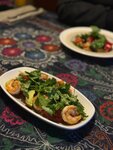 Спокойное место, каждый столик огорожен шторками/разделителем, ощущение уединенности. По еде: порции обычные, блюда стандартные для национальной кухни. Одно блюдо было пересолено на наш вкус - его убрали из счета оперативно. Рекомендую!