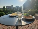Прекрасное место в 10 км от Калининграда, рядом аэропорт Храброво. До центра я Калининграда 20 мин на машине. Неплохие завтраки. Каши, горячее, сыр, мясная нарезка, кондитерские изделия, фрукты, творог, Сметана. Кофе, чай. Очень приветливый персонал. В номерах чисто! Что касается ресторана. Хорошее обслуживание, внимательные официанты. Большой выбор по меню. Интересные десерты. На территории открытый бассейн с подогревом. Территория очень ухоженная, утопает в цветах!