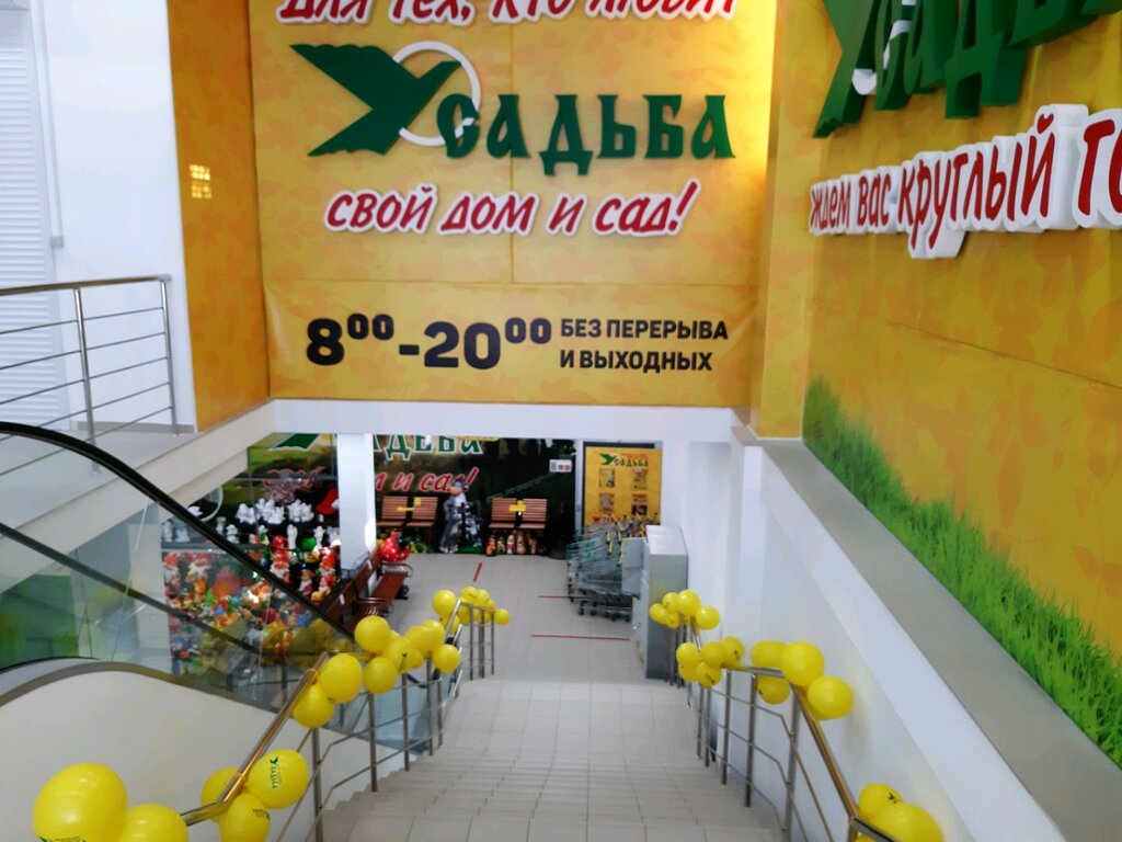 В одном комплексе уместилась Усадьба,большой магазин одежды и обуви Центр Моды,аптека,Пятёрочка.Сам магазин Усадьбы,не такой большой,но ассортимент достаточно разнообразный.Большой выбор товаров для сада.Магазин понравился.