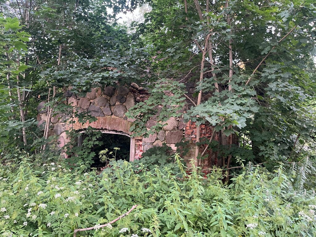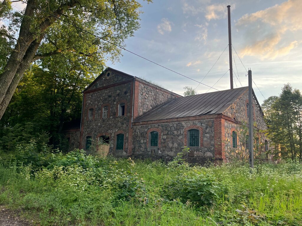 An interesting and beautiful building. Even though it's just a factory building. If desired, you can even get inside (from behind through the window). But there's nothing interesting inside. I see, it's just an old abandoned factory. There is a pond nearby. Swans swam. The manor itself is gone, only the park remains a little to one side, behind the stables.