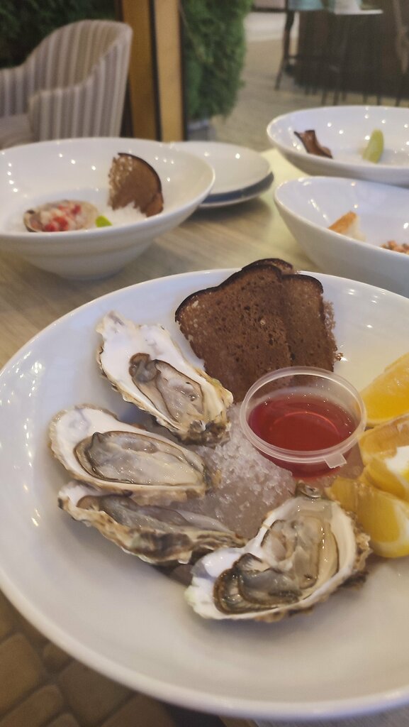 Приветливый и учтивый персонал, средиземноморская кухня, вкусные салаты, креветки, устрицы и мидии, понравилась пица с тонким и хрустящим тестом ,сочные томаты и ароматный базилик на тонком хрустящем тесте. Вкус простой, но при этом насыщенный и гармоничный, с большим количеством сыра. Напитки на любой вкус от без алкогольных коктейлей до сухих и игристых вин . Уютная атмосфера. Советую 👌