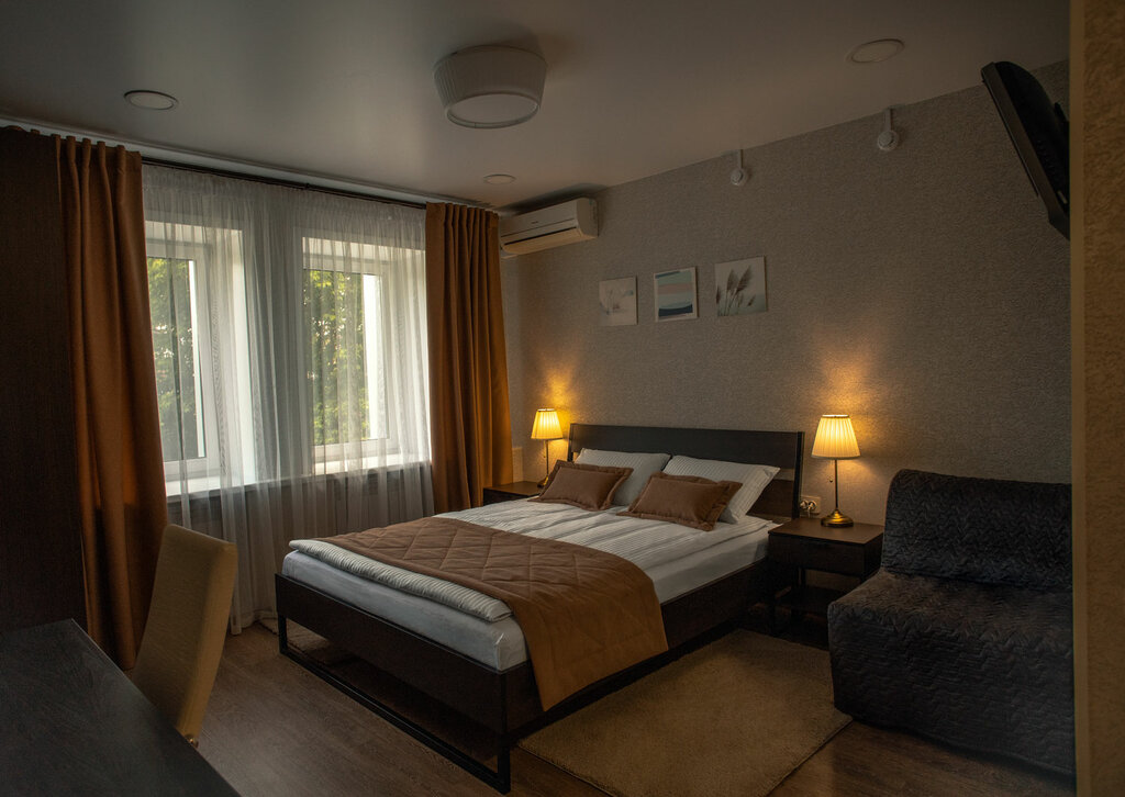 Улучшенный однокомнатный номер с двуспальной кроватью, ортопедическим матрасом и всеми удобствами (санузел с душевой кабиной, телевизор, кондиционер, холодильник, чайник).