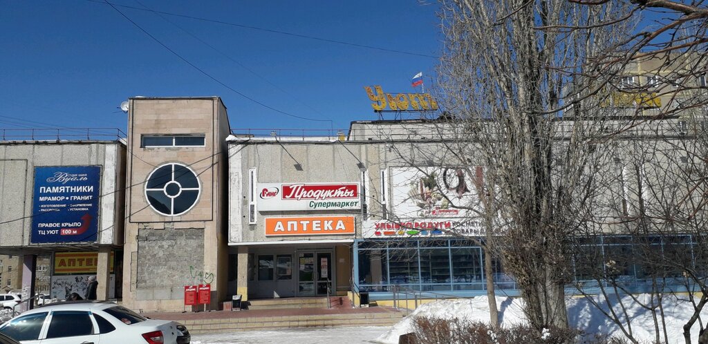 Сам тц хорош внутри.Есть магазины одежды и продуктов.НО снаружи выглядит не очень.Само здание снаружи напоминает универмаг из СССР,а буквы Уют ржавые.