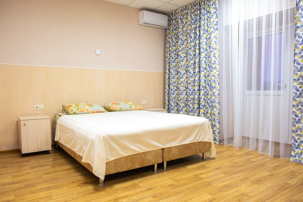 Двухместный номер с двуспальной кроватью со всеми удобствами. В номере установлен кондиционер, холодильник, СВЧ-печь, чайник. Гостям предоставляется набор для приготовления чая, одноразовые принадлежности для душа и тапочки. Шумоизоляция в номере.