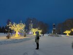 Владимир Ильич окружен новогодними деревьями, ночью с подсветкой. Рядом - елка в чехле. Необычно.