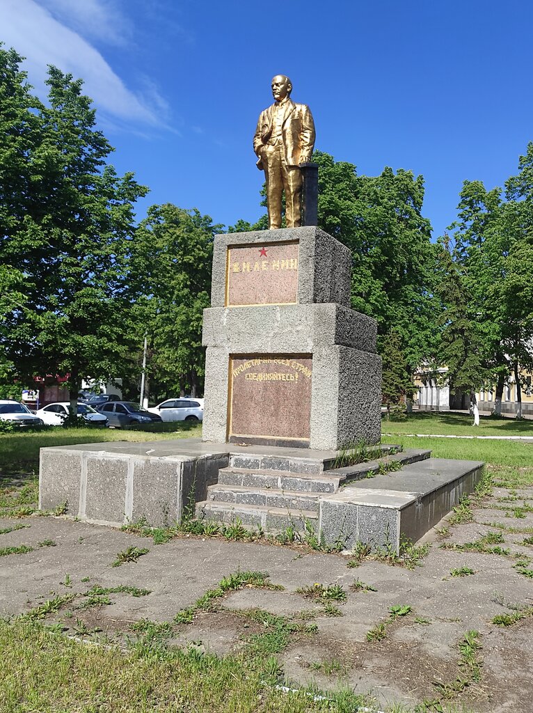 Памятник вождю выкрашен золотой краской. Необычно. Под Лениным на постаменте - знаменитый призыв «Пролетарии всех стран, соединяйтесь!». Ильич тут немного пижон, в хорошем смысле. Левая рука глубоко в кармане, другой опёрся о гранит.