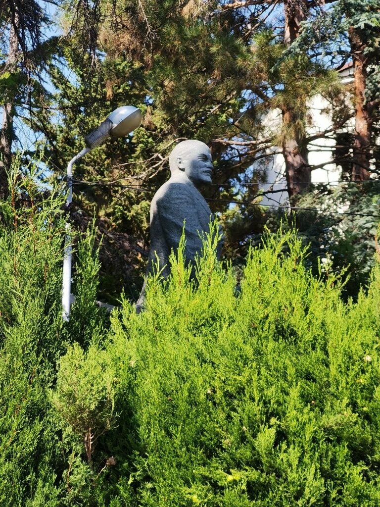 Ленин тут самый компанейский и человечный, чем где либо ещё во многих своих скульптурных ипостасей. Восседает себе на скамеечке , только что семки не лузгает , думу думает, смотрит сквозь человеческую суету и мельтешение всех проходящих неблагодарных потомков . Зрит неведомое нам ,рука отставлена, вдруг будет идти мимо ленинец или юный пионер который може присесть проникнутся моментом и близостью к Догме . Но времена прошли, бредут мимо него равнодушные , не познавшие его Учения. ни разу не заглянувшие не то что в Краткий Курс ВКПб, но и в его многотомники. Садятся под руку всякие селферы ,гримасничают , не понимают чести быть под сенью столь исторической Глыбы . И всё ж:.... Не зарастёт к нему ,народная тропа ...все идут к нему ...хотя бы сфоткатся .