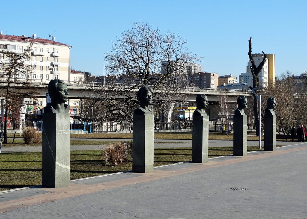 Памятники-бюсты первопроходцам космонавтики были установлены в 1967 году в начале аллеи. На нынешнее место были перенесены в 2008 году в связи с реконструкцией аллеи Космонавтов. Владимир Комаров - командир первого в мире экипажа космического корабля из 3 человек.