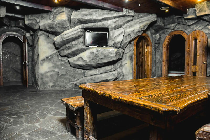 Малый банный зал с купальню. Парная, небольшой бассейн, комната отдыха и раздевалка. Комфортно для небольших компаний.