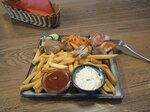 Шаверма на тарелке Мяса мало, жесткое. Картошка жесткая. На вкус одно подсолнечное масло. Заплатил, попробовал, есть не стал. Предложили заменить мясо или другое блюдо, не было времени ждать. Возврат денег не предложили