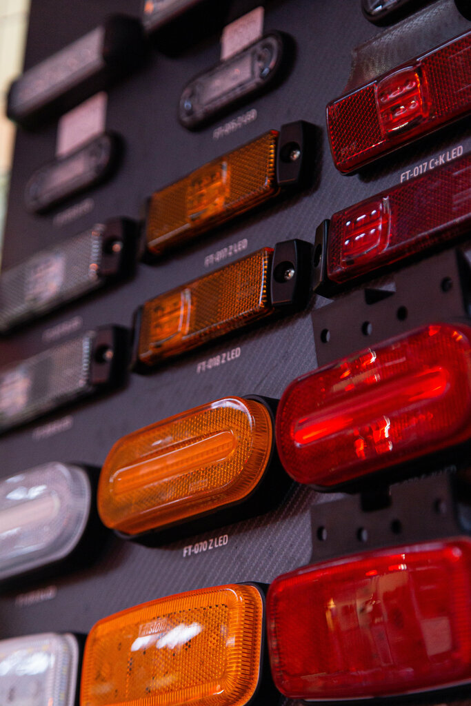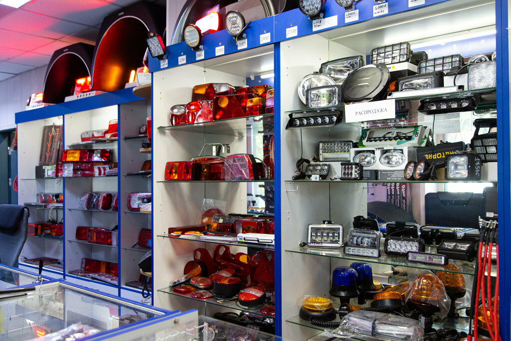 My very first store of lighting equipment and accessories for a tow truck. A large selection of products. All of them are on display, which is very convenient. You can check and evaluate it live, unlike online stores. There is a special stand with connected lanterns. That's really convenient.