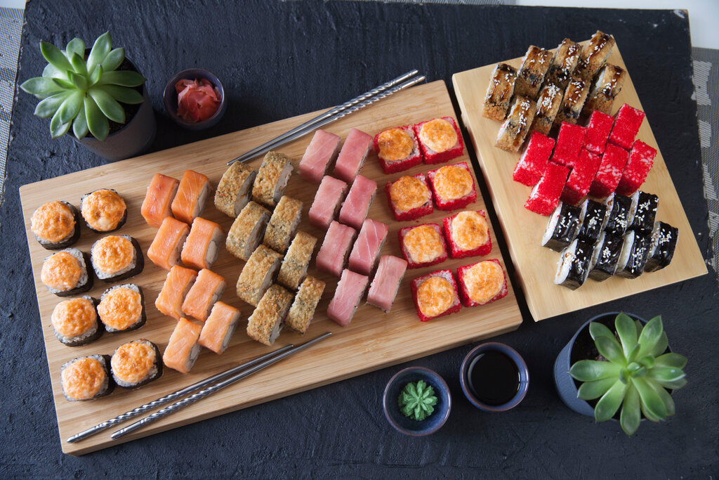 Variety of food:sushi and rolls, pizza