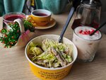 I ordered a Caesar Ball and a Peach Sketch. Caesar itself is not bad, although it is quite coarsely chopped and has little cheese for 12 rubles, but it is generally delicious. The leaves are not bitter, and the sauce is pleasant. I can't say the same about the Peach Sketch. Apart from the external differences, it tasted more like iced milk, no more. Tasteless, no peach flavor, except for the freeze-dried strawberries on top. Since I was going to get a drink, I'll give you 3 only for the atmosphere and friendliness of the staff.