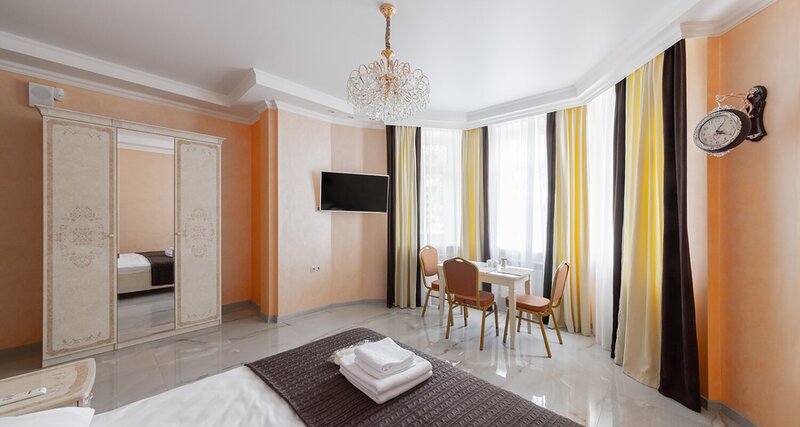 Улучшенный номер с 2-х спальной кроватью размера «king-size» и кухней, смарт ТВ с выходом в интернет, фен, чайник.