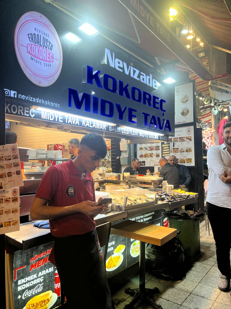 There is a snack bar at this place - Kokorec midye Tava . I don't know about Vera Kokorec - I haven't seen such a thing. Opposite there is a fish shop and in this eatery they will cook the selected grilled fish with you There is sea bass, it seems dorada, which is not dorada, mackerel, red fish and some other Shrimp, mussels I ordered Sea bass, super fresh, delicious, served with cabbage and onions, the portion is normal, for 175 lire. I was also impressed by the shrimp (I took the next table) which were cooked in a frying pan, on which they were served, with some kind of creamy tomato sauce, it seems to have looked very tasty. The service is super fast. I waited for my fish for 8 minutes. Despite the full landing, but there are only 4 tables.