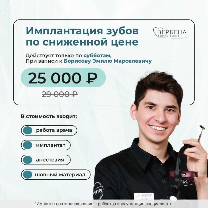 Хочу оставить отзыв о посещении клиники «Вербена Дент». Удаляла три зуба мудрости у доктора Борисова Эмиля Марселевича. Это был мой первый подобный опыт, и я очень боялась. Но Эмиль Марселевич — настоящий мастер своего дела! Все прошло очень быстро, аккуратно и, что самое важное, совершенно безболезненно (как во время, так и после процедуры, благодаря хорошей анестезии и современным препаратам). В клинике очень чисто, уютно, администраторы приветливы. Рекомендую этого специалиста всем, кто боится стоматологов — с ним точно не страшно!