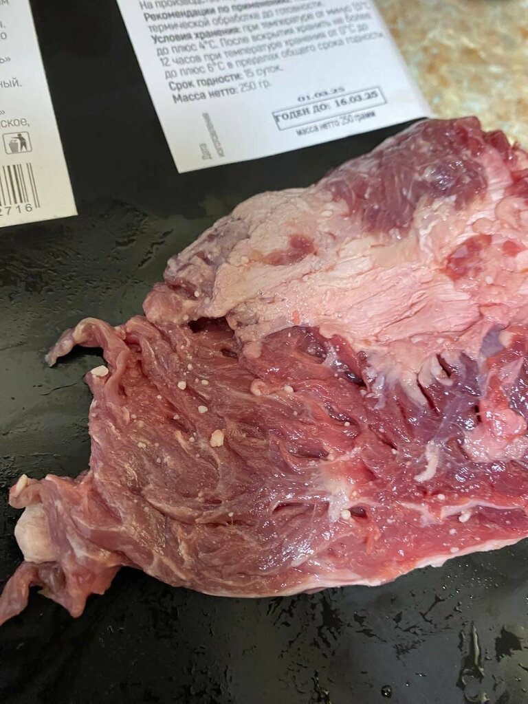 Тухлое мясо, хотя сроки в порядке Какие то крупинки по всему мясу, похожие на яйца паразитов. Воняет адски