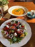 Хорошее кафе, мы с мужем пришли в обед, народу было не много, выбор блюд есть: салаты, супы, горячее, очень большой выбор десертов. На основное меню нам сделали скидку, на десерты, чай, кофе скидки нет. Приносят всё быстро, тыквенный суп показался островатым, но в меру. Кофе и десерт понравились.