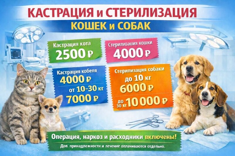 Veterinary clinic services:pet photo services, pet taxi, veterinary pharmacy, pet hotel, haircut, calling a veterinarian, castration, parasites treatment, grooming, beak trimming, euthanasia, cremation, chipping, vaccination, oxygen therapy, hospital