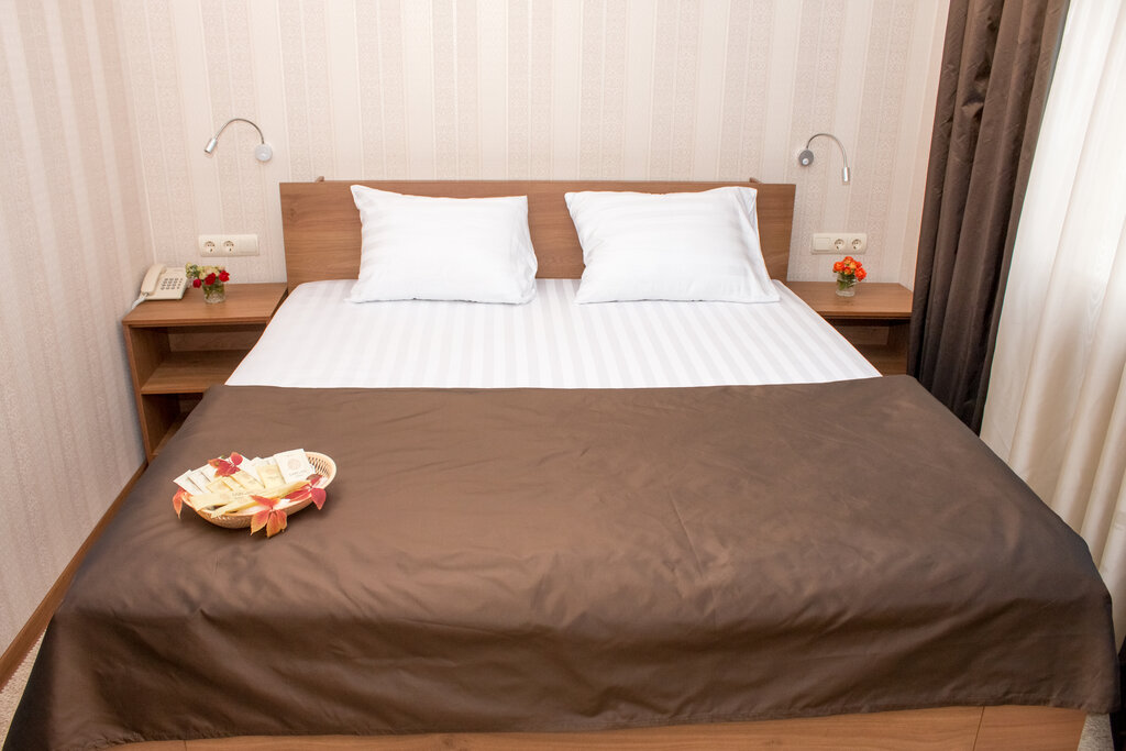 Просторные, светлые, уютные и чистые номера. Удобные ортопедические матрасы на кроватях. В номере есть телевизор, кондиционер. Есть возможность заказать завтрак, обед и ужин. Приятный персонал и не навязчивое обслуживание. В шаговой доступности великолепный парк "Русский Лес", каштановая аллея и "Майский Сад" для прогулок, церьковь, Дворец Культуры, масса магазинов разной направленности, остановочный транспортный комплекс, трасса.