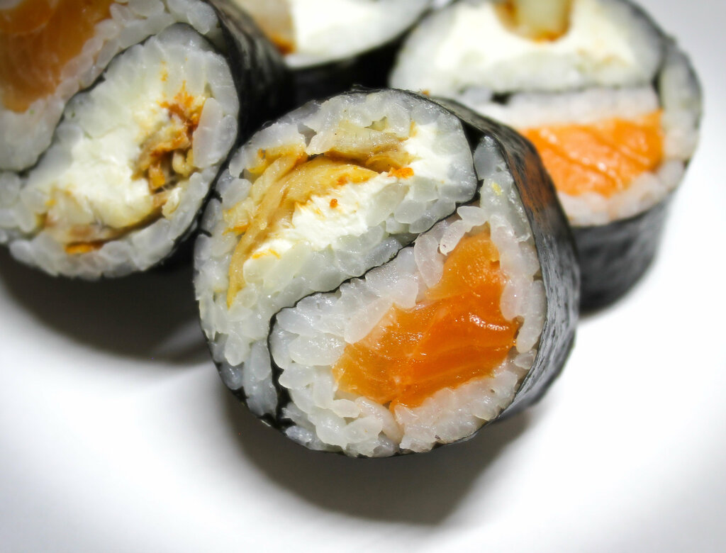 Роллы: Филадельфия, Канада снежная, Саппоро, Харумаки с курицей.