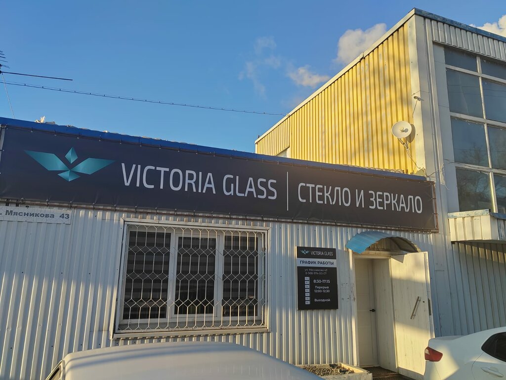 Volgograd, ulitsa Myasnikova, 43Вывеска Victoria Glass, офис находится с левой части здания от дороги