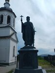 Я стою на смотровой площадке в парке имени А.С. Пушкина, под утреннее пение птиц наслаждаясь красивым видом с холма. Неподалёку в сторону красивой панорамы смотрит Князь Владимир и святитель Фёдор