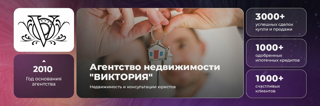 Выражаю огромную благодарность агентству недвижимости "ВИКТОРИЯ ". Замечательному руководителю и хорошему человеку Сокольниковой Виктории Александровне! Так же хочу отметить работу риэлтора Артёма он проявил высокий профессионализм , внимательность и терпение. Юристы Светлана и Елена всегда были на связи, отвечали на все наши вопросы, смогли найти оптимальные решения даже в нашей сложной ситуации, сделки прошли безопасно. Спасибо вам большое, вы профессионалы своего дела. РЕКОМЕНДУЮ!!!