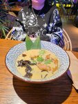 Томленый куриный бульон с добавлением сливочного сыра и чеддера, обжаренное филе цыпленка, яичная лапша, маринованное куриное яйцо, древесные грибы муэр, зеленый лук, имбирь, чеснок, свежая кинза, кунжут, чипсы нори