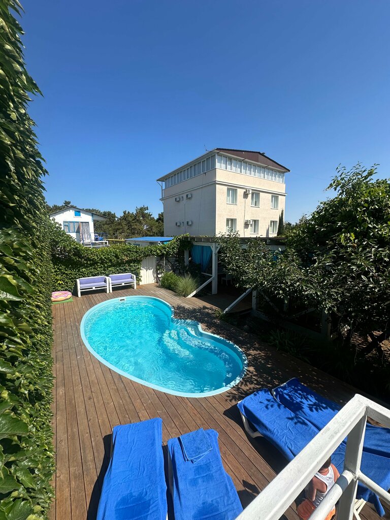 Отдыхали 5 дней. 2 номера. Очень красивые и чистые номера. Уборка через день. Питание входили только завтраки, но они выше всяких похвал. Спасибо повару Светлане. По 2 полноценных блюда. Ребёнок не мог осилить) так же брали обеда и ужины, но выбирали не комплекс, а отдельно. Питание в отеле дешевле выходит, чем в местных кафе. Бассейн небольшой, но людей в нем нет. До моря минут 5-7. На пляже брали зонтики и шезлонги. Есть убежище на всякий случай. Спасибо управляющей Нине Ивановне! Сервис на 5!