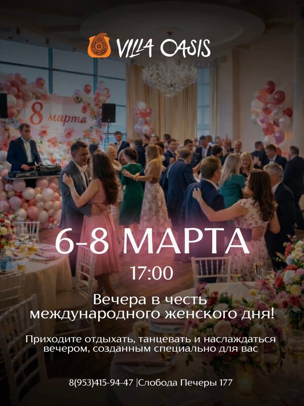 Играли свадьбу в феврале на 50 человек в этом заведении. Все прошло замечательно! Вкусная еда, быстрые и профессиональные официанты,которые всегда оказываются рядом в нужный момент,можно со своими напитками без пробкового сбора, красивый зал, требующий минимум украшений со стороны, к нему ещё советую взять художественный свет и тогда вообще бомба будет) Все гости остались в восторге от мероприятия проведённого в этом ресторане! Особенно хотелось бы отметить работу менеджера Натальи, которая дружелюбно подсказывала и давала советы по всем нашим вопросам во время подготовки свадьбы, очень ей благодарны за её работу и команде заведения ! Спасибо Villa Oasis!