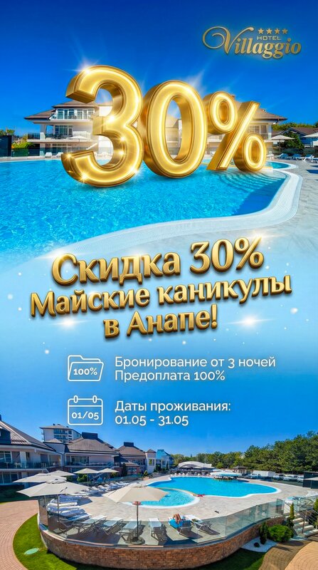 МАЙСКИЕ КАНИКУЛЫ СО СКИДКОЙ 30% Представьте: теплый майский вечер, бокал вина на террасе с видом на бассейн, а дети счастливо плещутся в по...
