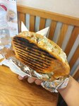 Зашли около одиннадцати. Свежей выпечки нет. На витрине все вчерашнее. Продавец даже не предупредил об этом. Скидок на вчерашнюю выпечку нет. Хотя все, уважающие себя заведения, делают скидку на вчерашнюю выпечку. Нам срочно нужно было взять в дорогу. Пирог с курицей и сыром клеклый, холодный, не вкусный. Шаурма тоже далека от идеала. 😐😕