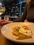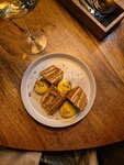 Приятная, я бы даже сказала — камерная, атмосфера. Модный приглушённый жёлтый свет, отдельно подсвеченные столы, вокруг много дерева и стекла. В дверях встречает милая хостес (там же и мини-гардероб), а в самом начале ресторана — бочки с вином и награды. Находиться комфортно, но при посадке ~40 человек сидело только две маленькие компании, включая нас — а это был самый вечер воскресенья! Но посуда, столы и подача — красота неописуемая. Честно говоря, меню не впечатлило. Если Вы хотите плотно поесть или попробовать разнообразные блюда — кажется, не сюда. Поскольку это в первую очередь бар, то большое внимание уделено закускам — сыры (есть даже Городецкие), паштеты, тартары, тарталетки с разными наполнениями. Как мне показалось, за весьма солидную цену. Ну и большое количество позиций ориентировано на рыбу и морепродукты. Взяли тарталетку с гребешком, страчателлой и клубникой — единственное, что приглянулось из меню. Вкус ровный и такой, как можно себе представить, увидев название) Т.е. ничего необычного — сливочно-морской со сладкими нотами. Ещё маринованные артишоки с муссом и маслом — оказались кислыми, что-то среднее между маринованной брюссельской капустой и зеленым перчиком, не хрустят. Мусс был неплохой сам по себе, только он сладкий, а артишоки кислые — странное сочетание... Ну и из десертов - медовик. Было неплохо, за исключением, пожалуй, внешнего вида — какой-то он весь неровный. Толщина слоёв разная, из-за чего попадался то сладкий кусочек, то насыщенный, то сухой. Алкоголя действительно много, а удивлением стали коктейли — один стакан может содержать и водку, и игристое, и вермут. Ещё постоянно подливают воду — это большой плюс! Подытоживая, к сожалению, вряд ли вернусь ещё