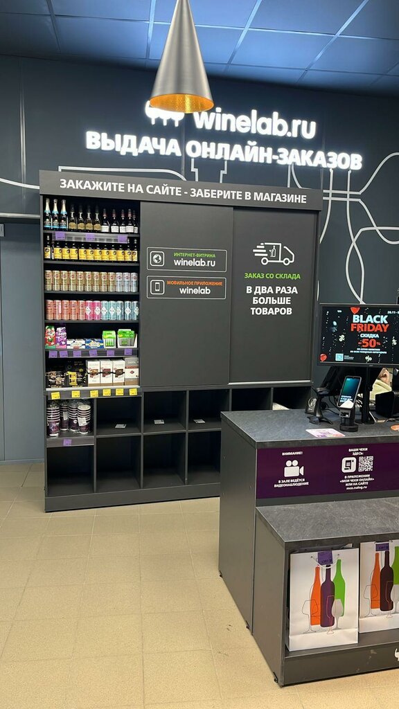 Отличный новый магазин Винлаб. Очень интересный формат - пункт выдачи интернет-заказов. Большой выбор товара, и его много- хорошая возможность закупиться на НГ. Приятный бонус в виде скидок на первый, второй и третий заказы 15%, 10% и 10% соответственно.