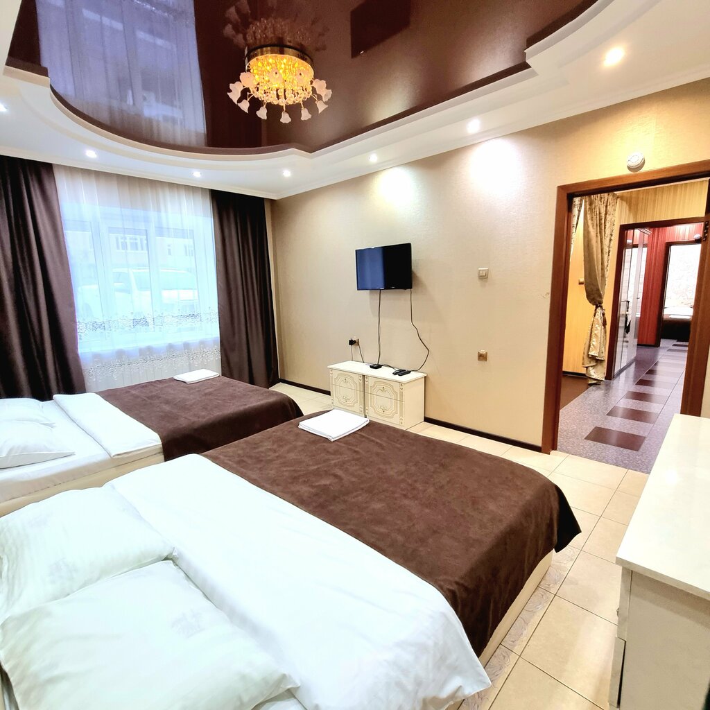 Бывал в разных гостиницах, но этот номер самый лучший где я побывал, 3 2-х местные кровати, диван кровать, отличная душевая кабинка, стиральная машинка, 3 телевизора настенных, интерьер тоже класный своя кухня,из минусов можно добавить разве что в номере маленький холодильник и в душевой кабины центральный душ не через сопла идёт вода а по бокам(также имеется в душевой кабинке обычная лейка и боковой душ, напор шикарный