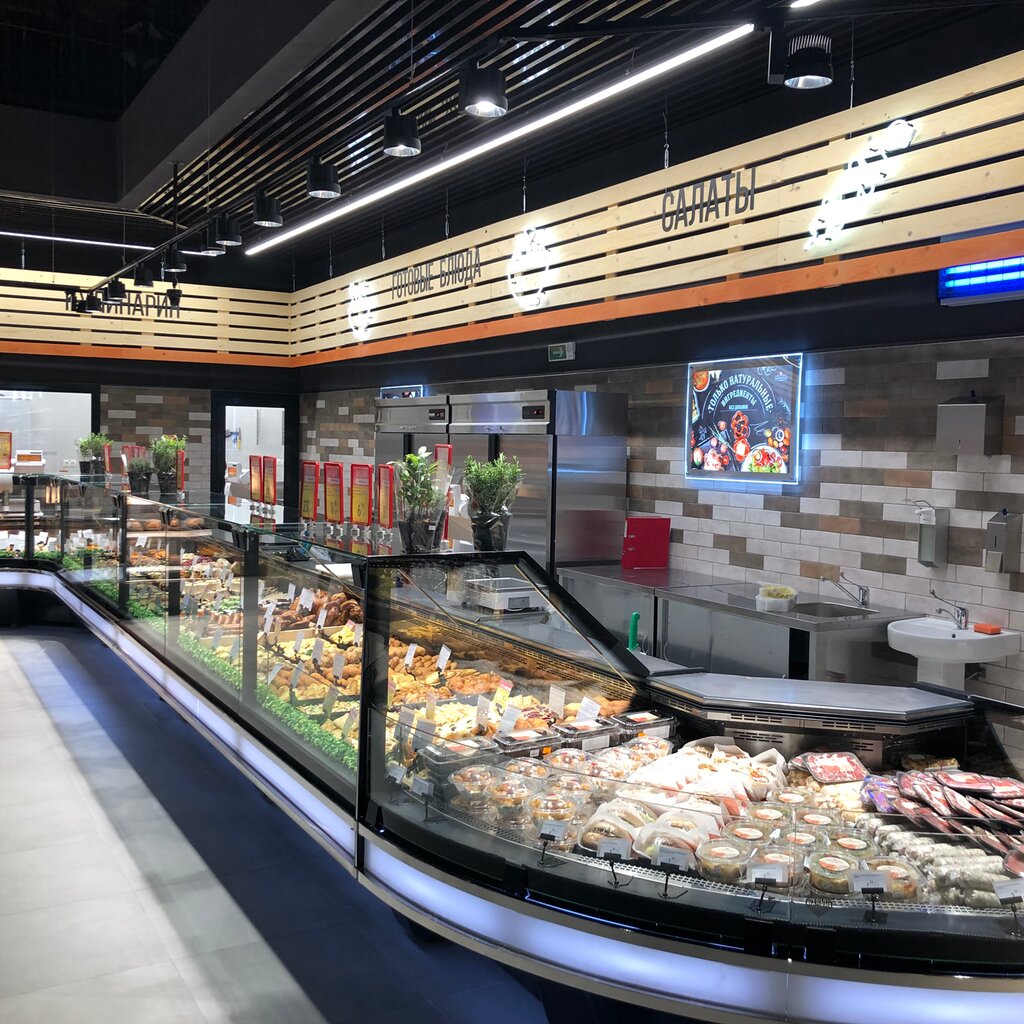 Супермаркет виталюр с собственной кухней. Плюсы: Вкусные собственные пирожные,вкусные пиццы (но дороговато как для самовывоза), посредственная кулинария и хлебобулочные Минусы: Катастрофически слабый ассортимент молочной продукции, не бывает шоколадных коктейлей Савушкин продукт, также очень часто в магазине заканчивается даже самый обычный спрайт(не говоря уже о версии без сахара),такое чувство там всего бутылок 20 завозят Также периодически возникают большие очереди.