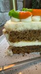 Морковно-пряный бисквит с грецким орехом, прослоен масляно-сырным кремом с ванилином и соком из апельсина