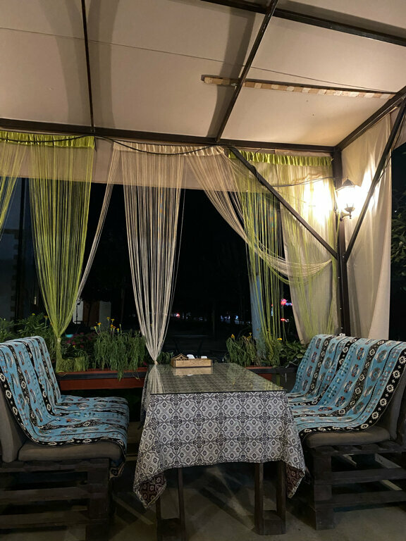 Скромная кафешка с залом под крышей и столиками во дворе. Туалет на улице, не комфортный. Ассортимент небольшой все умещается на ламинированном листе А3 с двух сторон. В зале удобные диваны с подушками. Готовят при тебе, так что надо подождать. Заказывали крем суп грибной и чечевичный - очень вкусно. А так же пиццу - тоже вкусная, не хуже чем в Додо. 2 крем супа и травяной чай обошёлся в 480 р. Если брать мясо, то чек на двоих приблизиться к тысяче. Народу мало. Рекомендую.