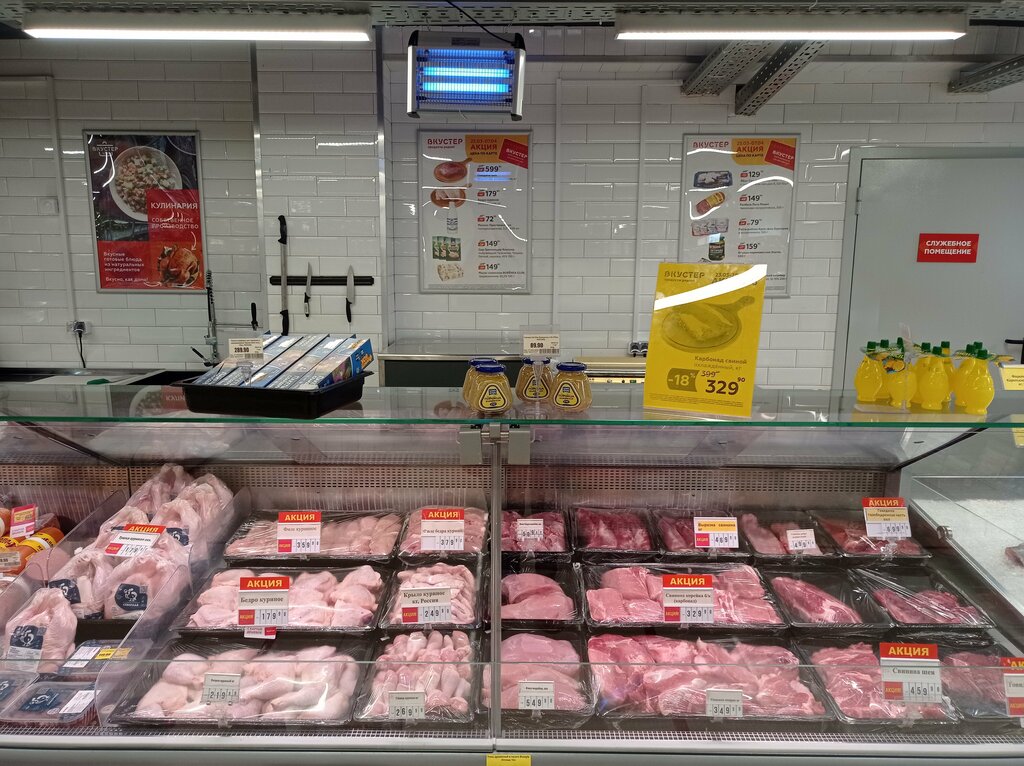 Хороший магазин рядом с домом. Чисто, ассортимент вполне разнообразный, есть акции. Но! Прошу руководство обратить внимание и принять меры, в мясном отделе постоянно отсутствует сотрудник. Есть звонок, но и после его неоднократного нажатия никто не приходит. Меньше всего хочется после работы ожидать 10 минут, чтобы взять кусок мяса. Если проблемы с персоналом - сделайте этот отдел самообслуживания. Витрина с фасованными мясом и курицей.